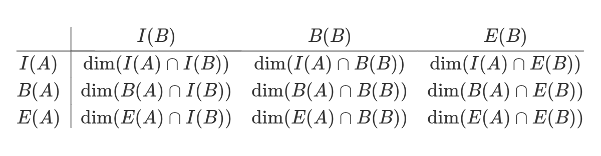 The Dimensionally Extended Nine-Intersection Model (DE-9IM) is a way to describe how two geometries (points, lines, polygons) relate in space. It looks at the intersections between each object's interior, boundary, and exterior, resulting in a 3×3 matrix.